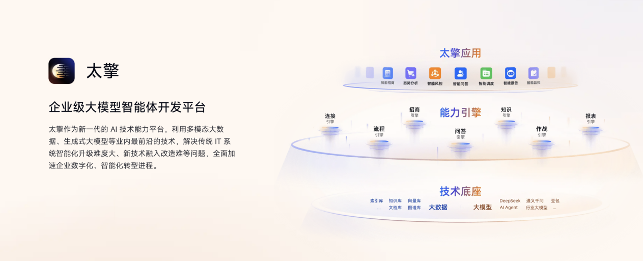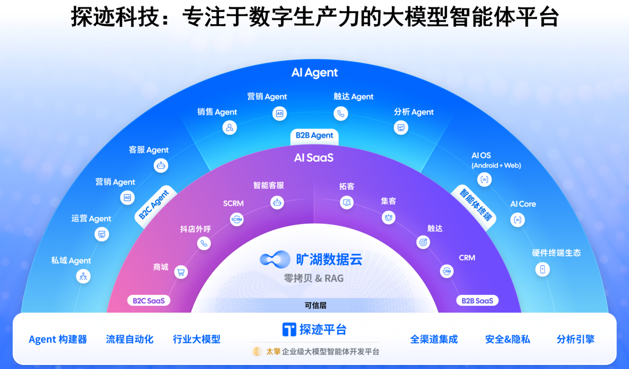 “太擎”作为企业级大模型智能体开发平台,相当于制造AI员工的"大脑",能让企业像搭积木一样快速定制和部署数字员工,彻底解决了AI落地门槛高、周期长的问题;而“旷湖”数据底座则是AI员工的“养料”,汇聚的海量实时商业数据,让探迹科技的数字员工不是空有其表的花架子,而是能做出精准判断的业务专家。