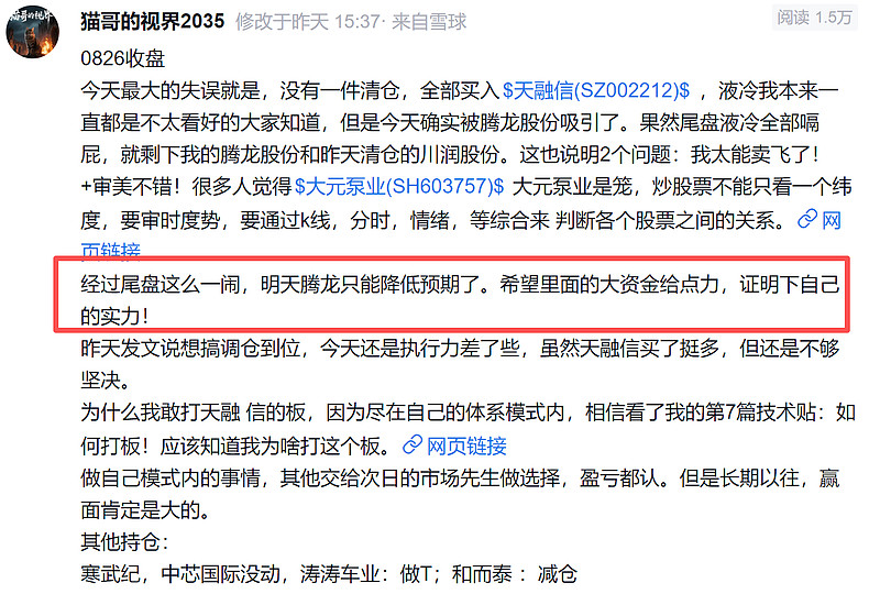 昨天收盘 发文的基调:非常看中天融信,恨不得全仓它!而对于腾龙股份,是液冷里面我唯一套利的,你看昨天尾盘液冷全部砸了,但是回封的只有腾龙等少数几个,且今天高溢价的也只有腾龙股份。这就是理解力,这就是审美!所以,今天还有人来问我:腾龙没涨……我的天,今天这个冲高还不强吗?让你高溢价跑你不跑?你还想连板????你的理解力呢?