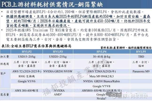 2、根据福邦投顾,HVLP4/5成为M9材料主流,目前整体市场产能HVLP1-4合计约为1200吨,但如果实际转HVLP4,会低于此产能数据。根据供应链调查,主流日系大厂2025年的HVLP4铜箔产能约350吨/月,加计目前台厂、卢森堡则约700吨/月;26年日厂扩产后,产能可提升至450-550吨/月,仍低于26年交货需求,呈现供不应求的情况。