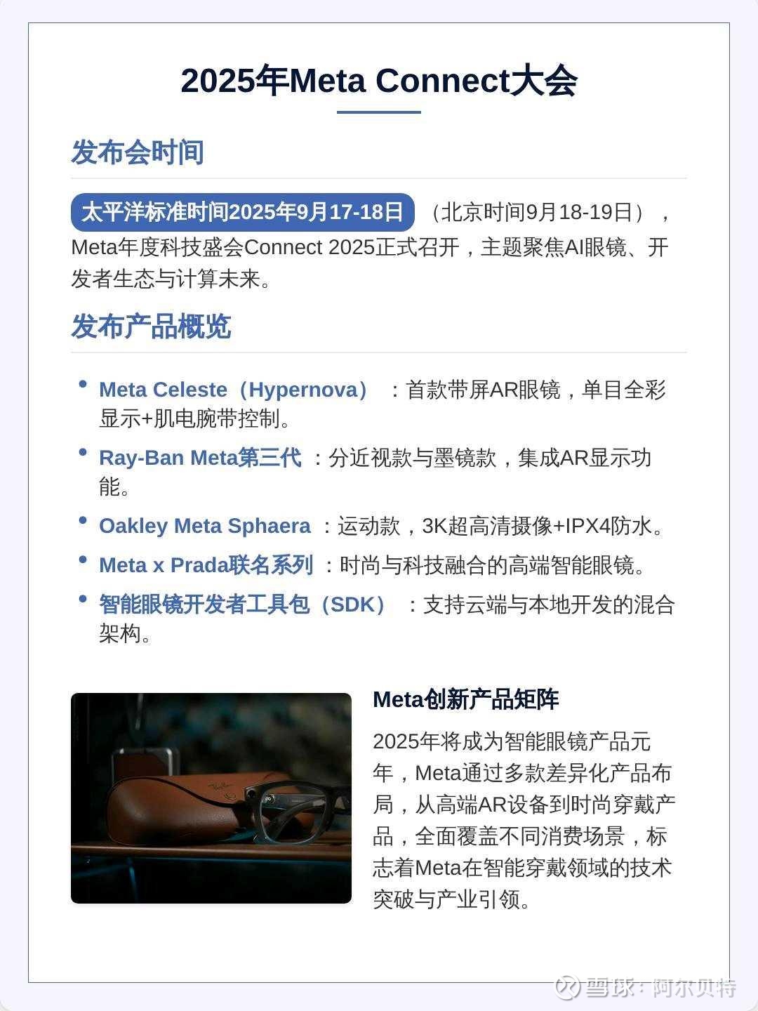 2025年Meta Connect大会将推出多款AI/AR眼镜和开发者工具,用创新产品组合和生态布局打开智能眼镜消费级市场,显示Meta在智能穿戴领域的技术实力和行业影响力。