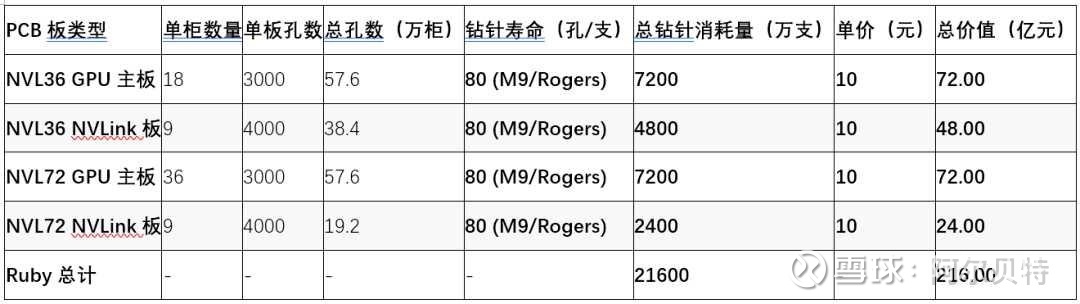 Ruby方案(极限):GPU主板与NVLink板均可能采用M9或Rogers混压,钻针寿命进一步下降,假设为80孔,且板厚增加,需更长、更贵的钻针。