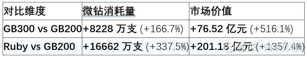 数量级跃升:仅仅因为GPU主板从M8升级到M9,就使得16万柜订单的微钻总消耗量从不到5000万支,暴增至超过1.3亿支,增量超过8000万支。