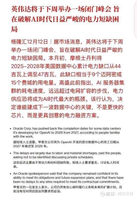 前两天比较大的两件事就是英伟达即将举办的闭门会和甲骨文数据中心的delay,虽然后来甲骨文的人出来辟谣,但其实由于劳动力和电力的短缺,delay在所难免。