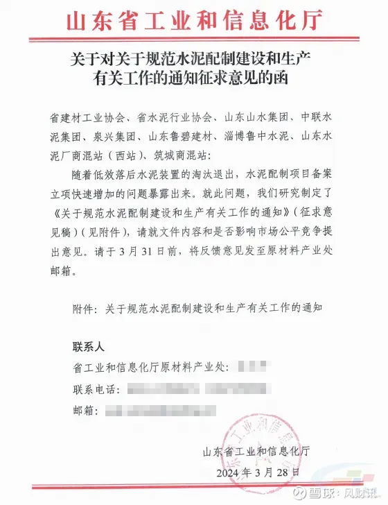3月末,一份疑似由山东省工信厅印发规范水泥配制建设和生产有关工作的通知征求意见函在网络中流传,引发关注。
