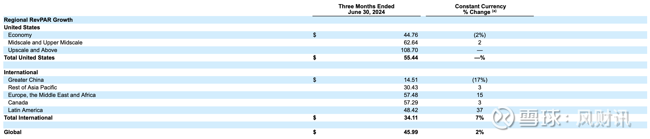 从全球其他区域来看,大中华区RevPAR为14.51美元,同比减少17%;拉丁美洲地区RevPAR增幅最高,为37%,录得34.11美元。