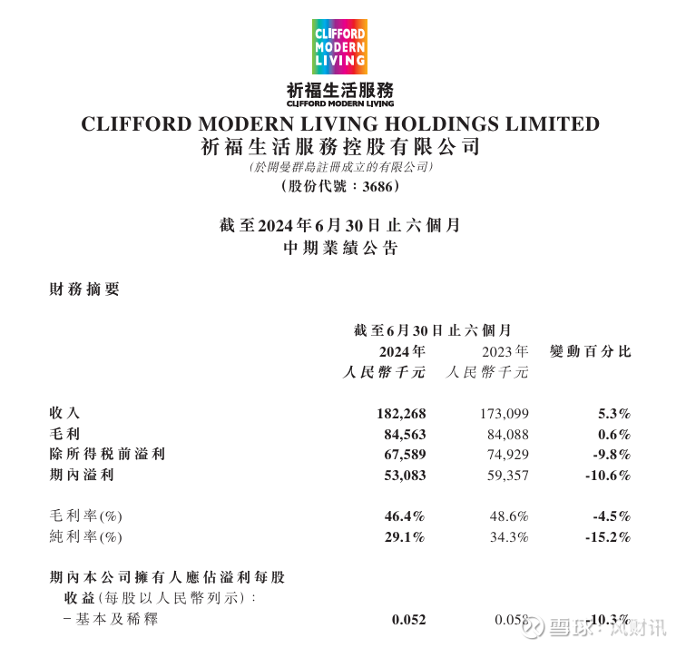 风财讯消息 8月26日晚,祈福生活服务发布2024年上半年业绩公告。