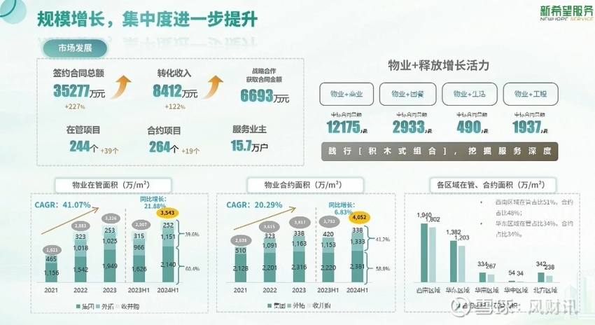 截至2024年6月30日,新希望服务在管项目数量为244个,在管楼面面积约为3540万平方米,较2023年同期增长约21.8%;集团签约项目数量为264个,签约面积为4050万平方米,较2023年同期增长约6.8%。