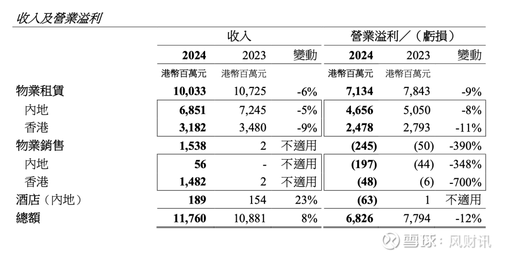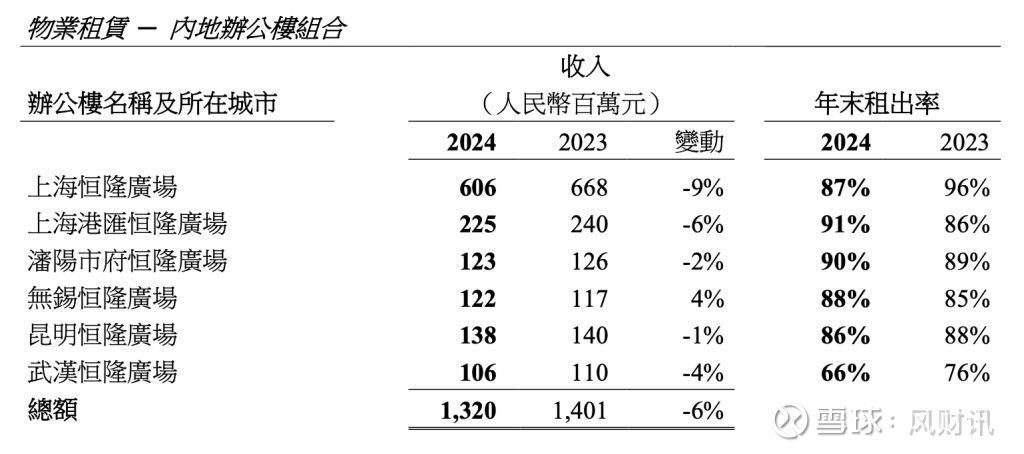 商场方面,2024年恒隆于内地的商场租合收入下跌,其中高端商场租合收入下跌4%。
