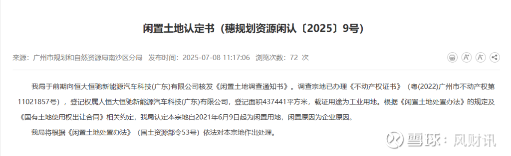 该认定书提到,广州市规划和自然资源局南沙分局在前期向恒大恒驰新能源汽车科技(广东)有限公司核发《闲置土地调查通知书》,调查宗地已办理《不动产权证》(粤【2022】广州市不动产权第11021857号),登记权属人恒大恒驰新能源汽车科技(广东)有限公司,登记面积437441平方米,土地用途为工业用地。根据《闲置土地处置办法》的规定及《国有土地使用权出让合同》相关约定,认定本宗地自2021年6月9日起为闲置地块,闲置原因为企业原因。
