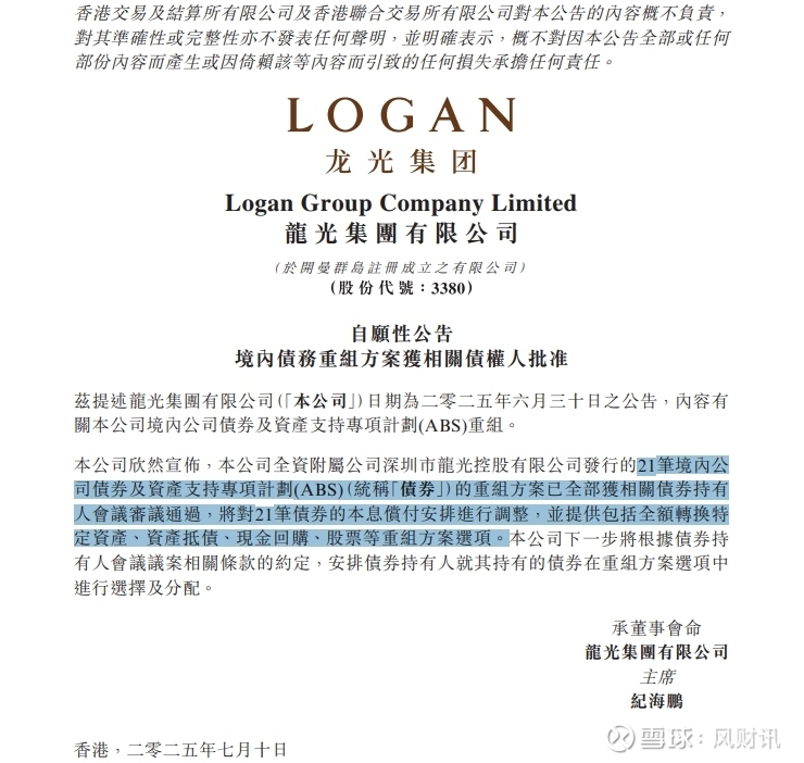 风财讯消息 7月10日,龙光集团于港交所发布自愿性公告,内容为其发行的21笔境内公司债券及资产支持专项计划(ABS)(以下简称:债券)的重组方案已全部获相关债券持有人会议审议通过,其将对21笔债券的本息偿付安排进行调整,并提供包括全额转换特定资产、资产抵债、现金回购、股票等重组方案选项。