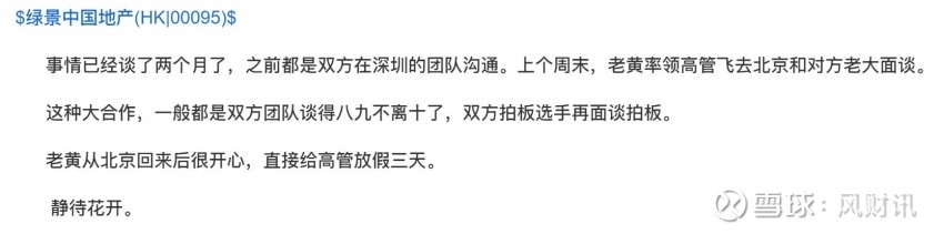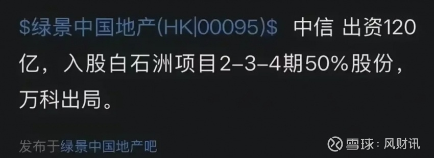 风财讯:近日在绿景中国地产股吧流传多个消息称,中信集团旗下中信城开拟出资120亿元入股绿景中国地产(HK00095)白石洲项目2-3-4期50%股份。