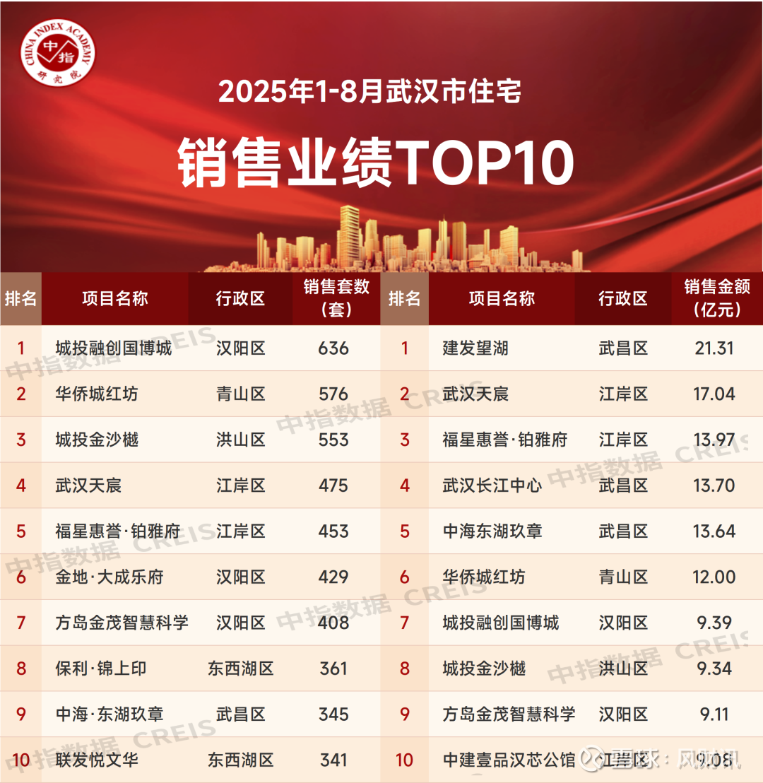 特别说明:武汉房地产项目销售数据统计是以2025年1月1日至2025年8月31日期间销售的商品住房为统计口径,主要依据中指数据CREIS在武汉市的销售监测数据;本报告仅供参考,课题组不对使用报告及其内容所引发的任何直接或间接损失承担责任。