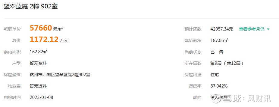这套备受瞩目的房源,是望翠蓝庭2号楼的902室,是这幢总高10层的小高层中的次顶楼,户型建面187.06㎡,最终以总价1619万元(含一个车位)成交。