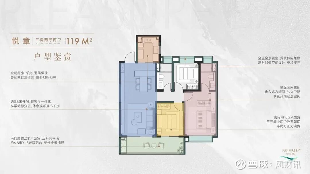 而且,建面约119㎡户型整体格局非常方正,三开间朝南 双阳台设计,南向超10米开间,阳台宽约6.8米,全屋多达4个飘窗,不仅实用性强,还带分户式科技系统,居住尊崇感满分!