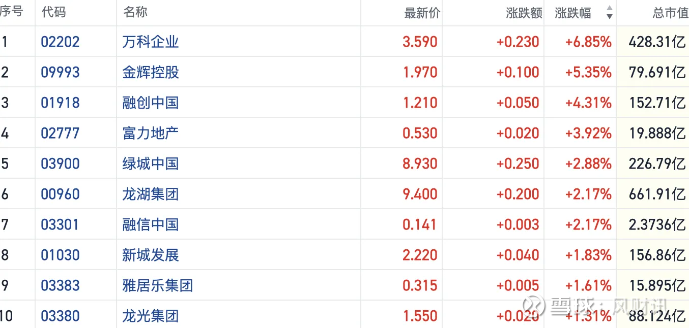 截至发稿,万科企业(02202.HK)涨近7%,融创中国(01918.HK)涨超4%,绿城中国(03900.HK)等多只个股涨超2%以上。