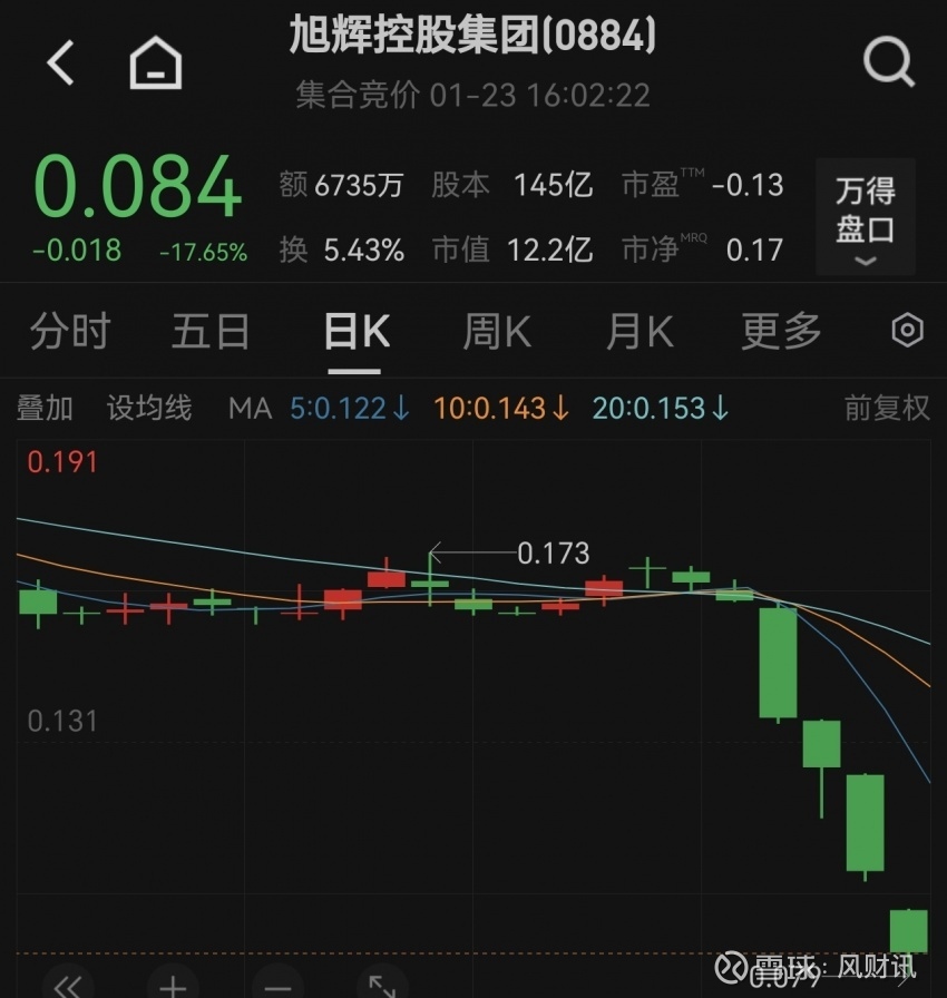 凤凰网风财讯:1月23日,旭辉控股集团(00884.HK)股价跌超17.6%,收报0.084港元,创上市新低。