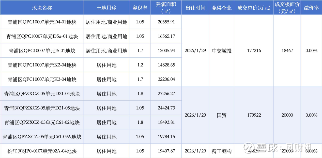 其中,国贸以17.99亿元底价拿下青浦赵巷地块,中交城投17.72亿元底价落子青浦老城厢,精工钢构则以4.46亿元底价,将松江九亭一幅宅地收入囊中。