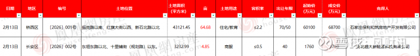 凤凰网房产土拍快讯,2月13日,石家庄公共资源交易中心公开出让〔2026〕001号地、002号国有建设用地使用权,最终两宗地块成功出让,保利拿下振三街改造用地。