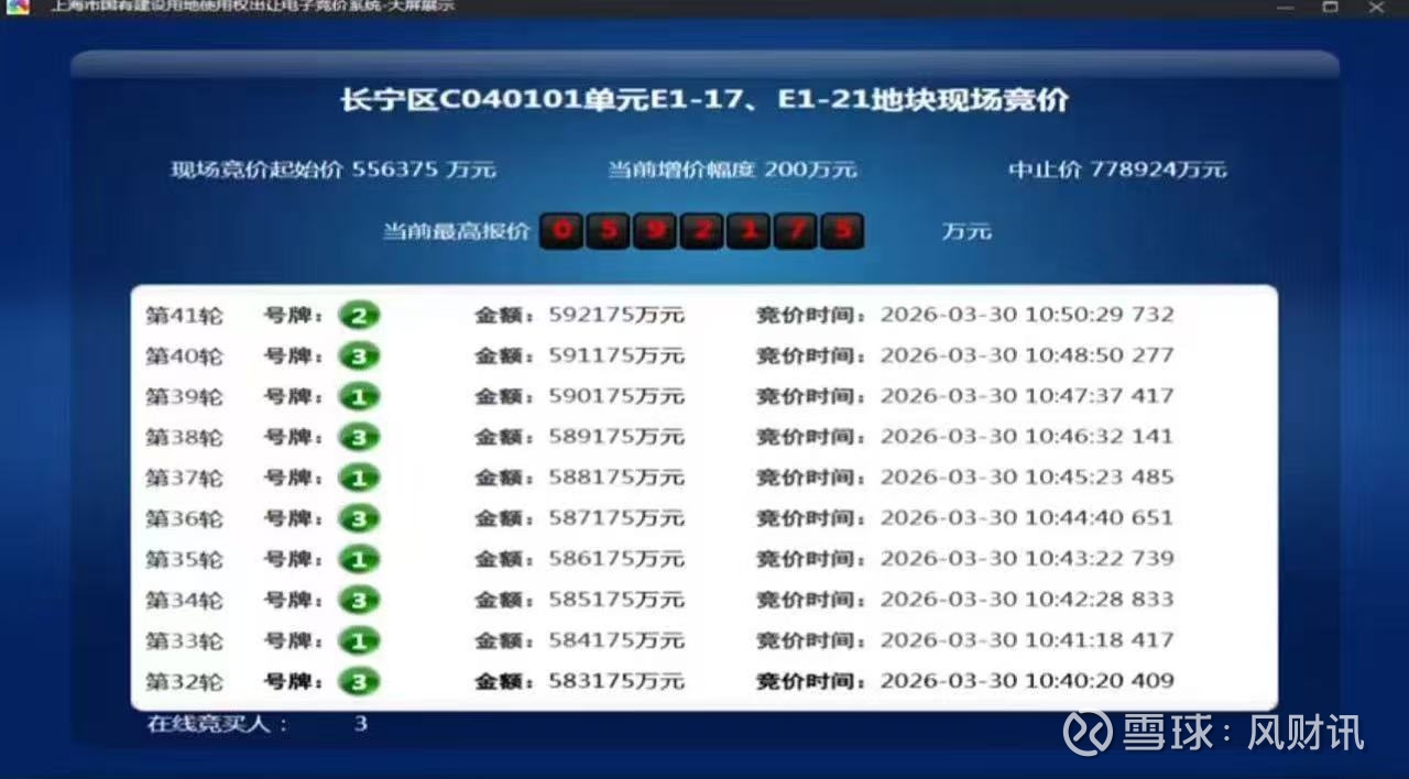 地块出让过程竞争激烈。前40轮竞价主要在1号竞买人华润&新长宁联合体与3号金茂之间展开。直至第41轮,保利发展(2号)突然加入战局并果断出手,最终成功摘得该地块。