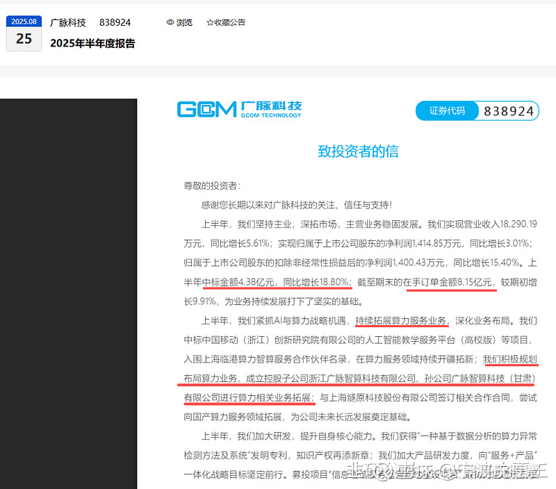 公司在半年报中,骄傲地披露:公司抓住了ai和算力战略机遇,持续拓展算力服务业务。并成立下属公司浙江广脉智算科技有限公司、孙公司广脉智算科技(甘肃)有限公司进行算力相关业务拓展,更是与国产算力领头羊燧原达成合作进军国产算力服务领域。