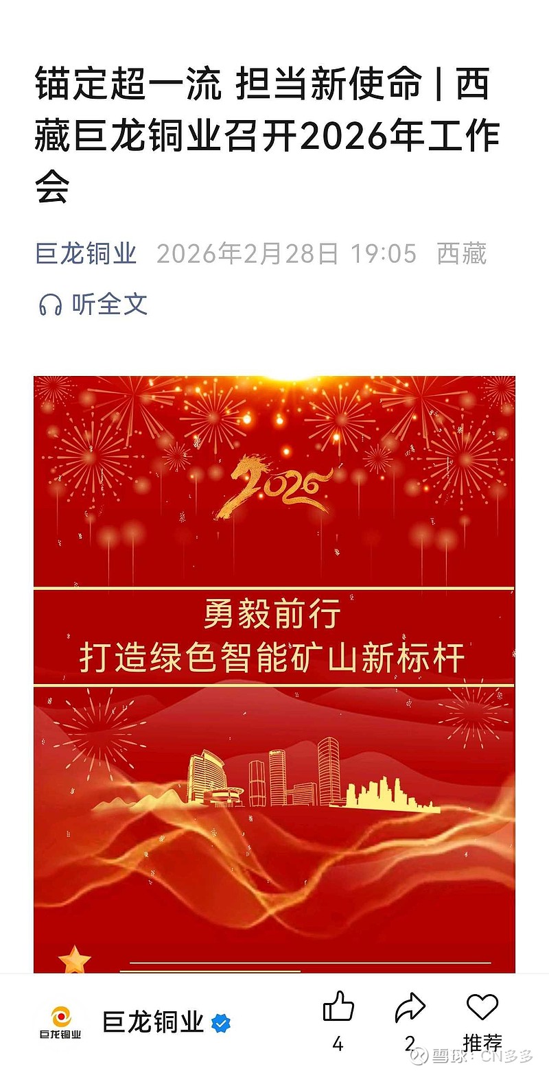 $藏格矿业(SZ000408)$ $紫金矿业(SH601899)$锚定上产方针,全力释放产能:确保巨龙一期稳产,攻坚巨龙二期达产达标,按期完成相关验收手续;谋定巨龙三期规划,力争纳入国家重大项目。深挖金属资源潜力,推进矿区深部补勘增储,完成地质勘查会战,加大金矿增储;积极开展矿权并购,拓展资源版图;强化有价金属回收与技术攻关,提升资源综合效益,为公司长远发展筑牢根基。