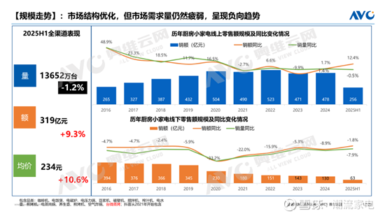 2025年上半年,厨房小家电市场呈现“额涨量跌”的分化态势,行业增长动能不足的问题逐渐显现。据奥维云网(AVC)2025年1-6月全渠道推总数据显示,厨房小家电(包含品类:咖啡机、电饭煲、电磁炉、电压力锅、豆浆机、破壁机、搅拌机、榨汁机、电水壶、煎烤机、电蒸炖锅、养生壶、煎烤机、台式微蒸烤、空气炸锅)整体零售额319亿元,同比上涨9.3%,但零售量仅13652万台,同比下降1.2%;线上渠道也呈现出类似的表现,零售额256亿元同比上涨12.4%,零售量却同比下滑0.5%。