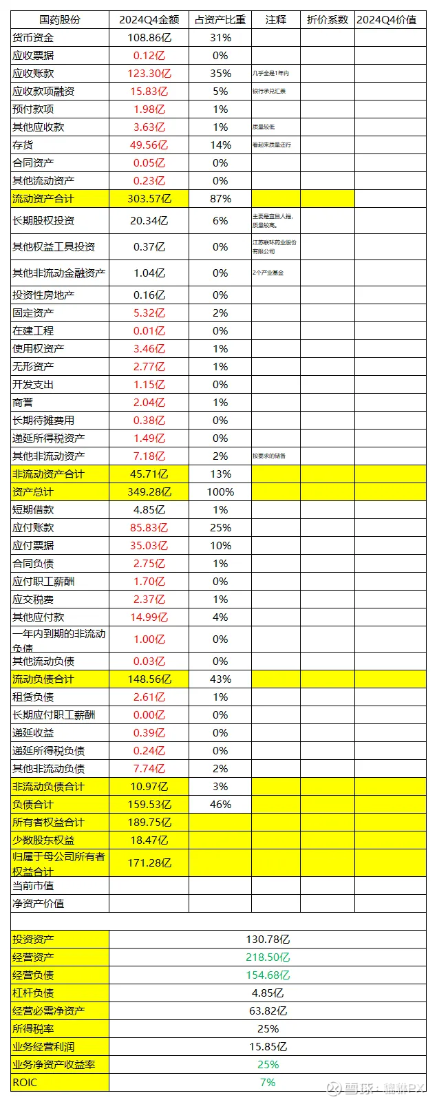 $国药股份(SH600511)$ 当前的市值约为226亿元,合并财务报表上“现金及现金等价物”约为109亿元,有息负债约4.85亿元,公司“少数股东权益”占比约为10%,净现金穿透到上市公司约为94亿元。公司账面价值20亿的“长投”为“宜昌人福”股权,属于优质资产,其实际价值要远高于账面的20亿。