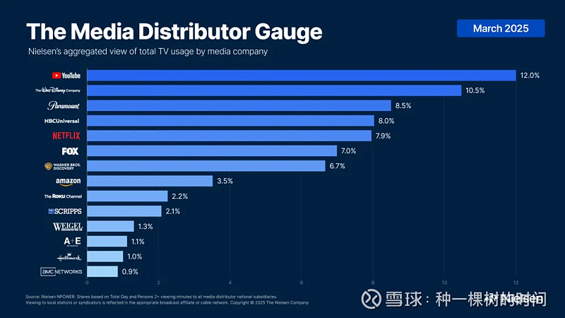 1.YouTube 已连续 26 个月成为美国电视上观看次数最多的流媒体平台(从去年的10%涨到了最近的12%),2.单从这个比例上看,$华纳兄弟探索(WBD)$ 6.7%的比例,而市值只有奈飞的1/20,迪士尼的1/8,是不是有点低估了?