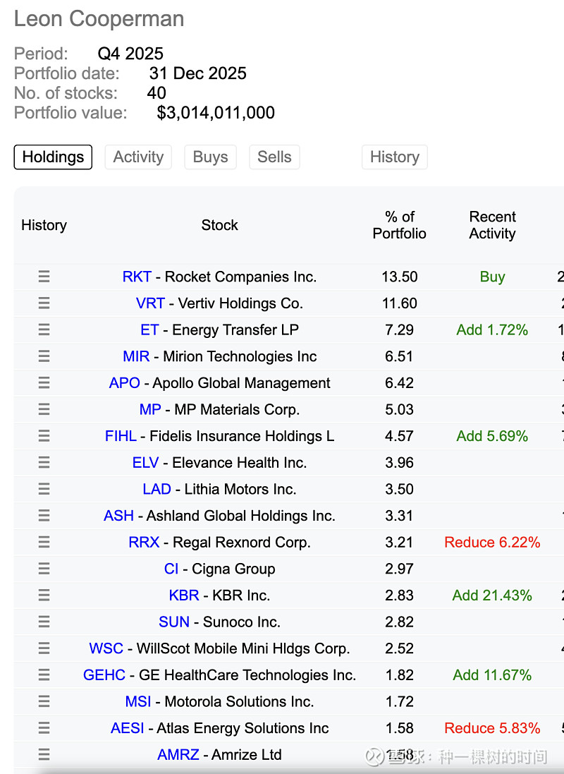 接上一条,#13F持仓报告# 2025Q4的更新。Leon Cooperman大幅买了$Rocket Companies(RKT)$ 直接买到了第一大持仓,mark一下。