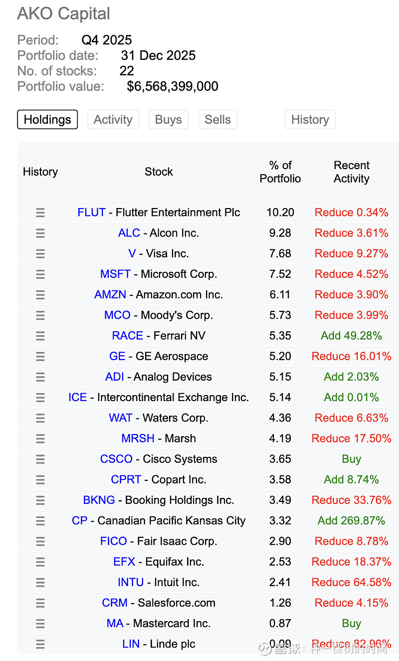 AKO 加仓了法拉利(上季度低点,2026最新财报后已经反弹),买入了CSCO和mastercard。