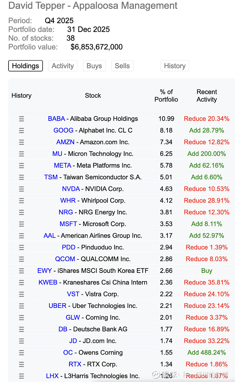 David Tepper - Appaloosa Management 加仓了$美光科技(MU)$ ,建仓了EWY(三星和SK),加仓了$谷歌A(GOOGL)$ 和META。减了阿里巴巴。