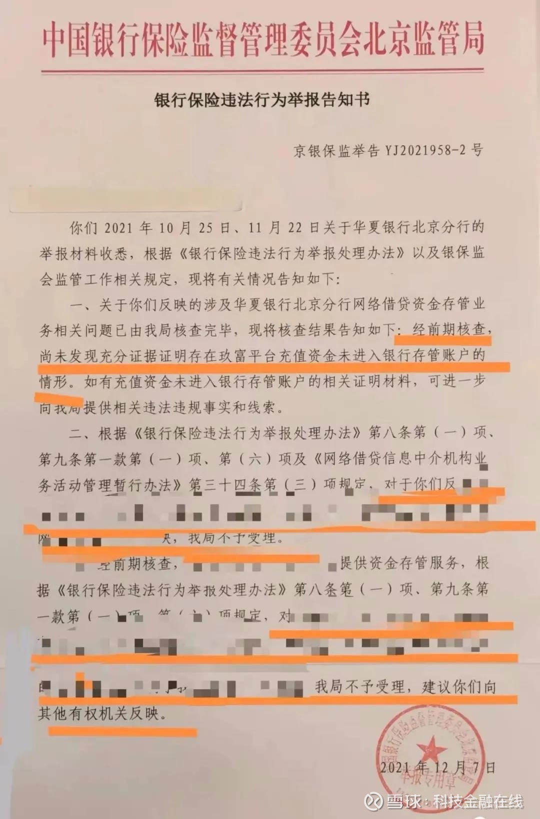 此前,有玖富普惠信息中介平台的出借人收到北京银监局关于《银行保险违法行为举报告知书》,告知书中提到:未发现充分证据证明存在玖富平台充值资金未进入银行存管账户的情形。