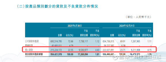 2024年底,渤海银行不良贷款金额为164.8亿,关注类贷款金额为260.63亿,这两项金额合计为425.43亿。而到了2025年上半年,分别增长到了172.69亿和277.65亿,合计为450.34亿。增加了24.91亿。
