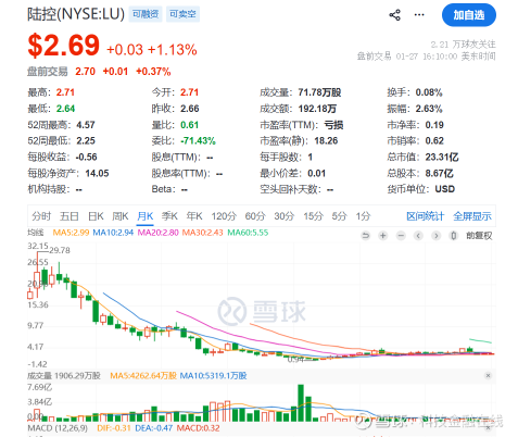 陆金所曾经以互联网金融龙头姿态出世,一直戴着耀眼的光环,市值最高的时候将近400亿美元。目前,陆金所在纽约证券交易所仍然在正常交易,最新收盘价为2.69美元,市值为23.31亿美元。
