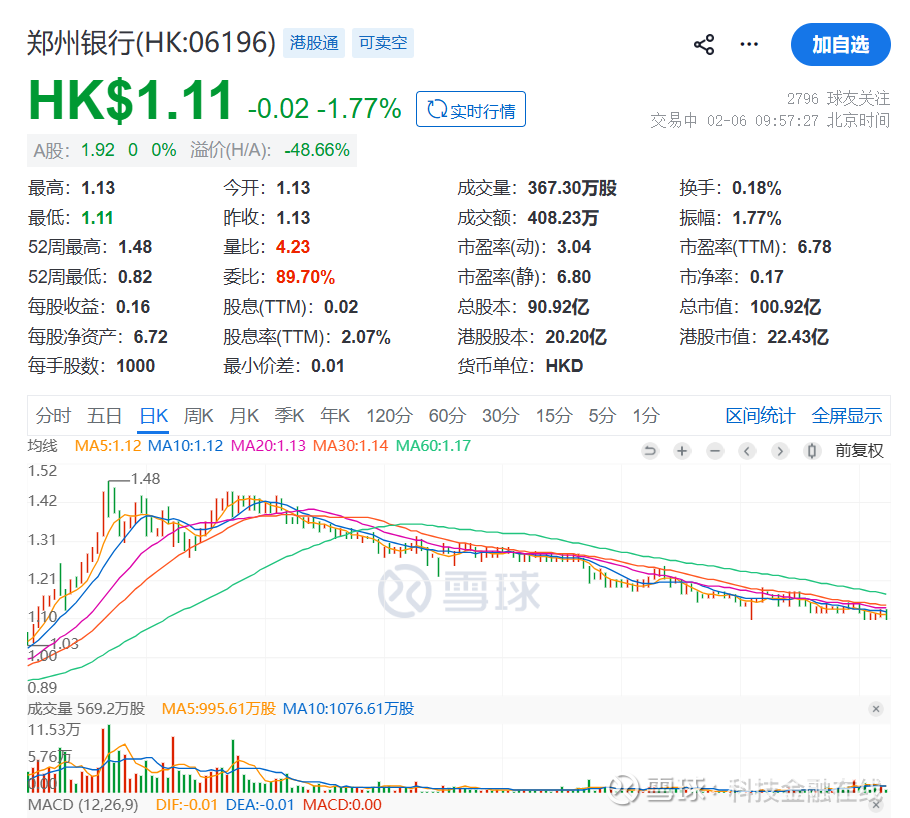 如今,郑州银行股价已经跌到了1.12港元,距最高价跌幅超过24%。
