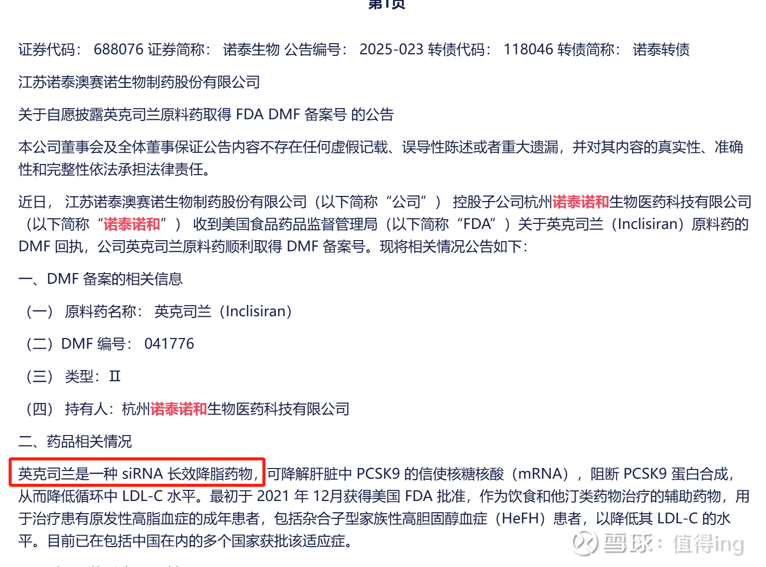 最近很火的siRNA药物,英克司兰/ siRNA 长效降脂药物品种,奥锐特+诺泰生物拿到美国DMF备案,是目前为止国内唯二的两家药企。