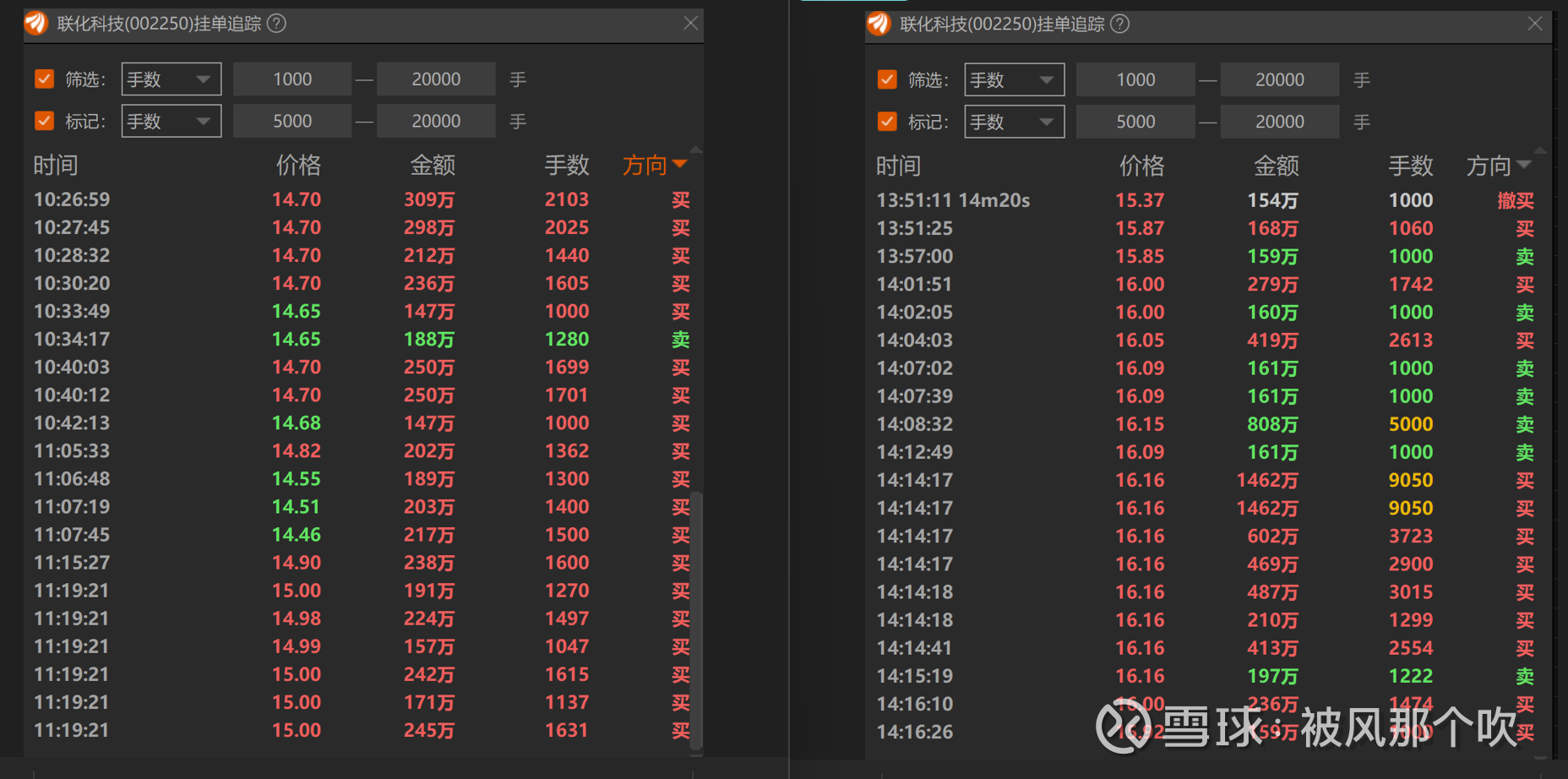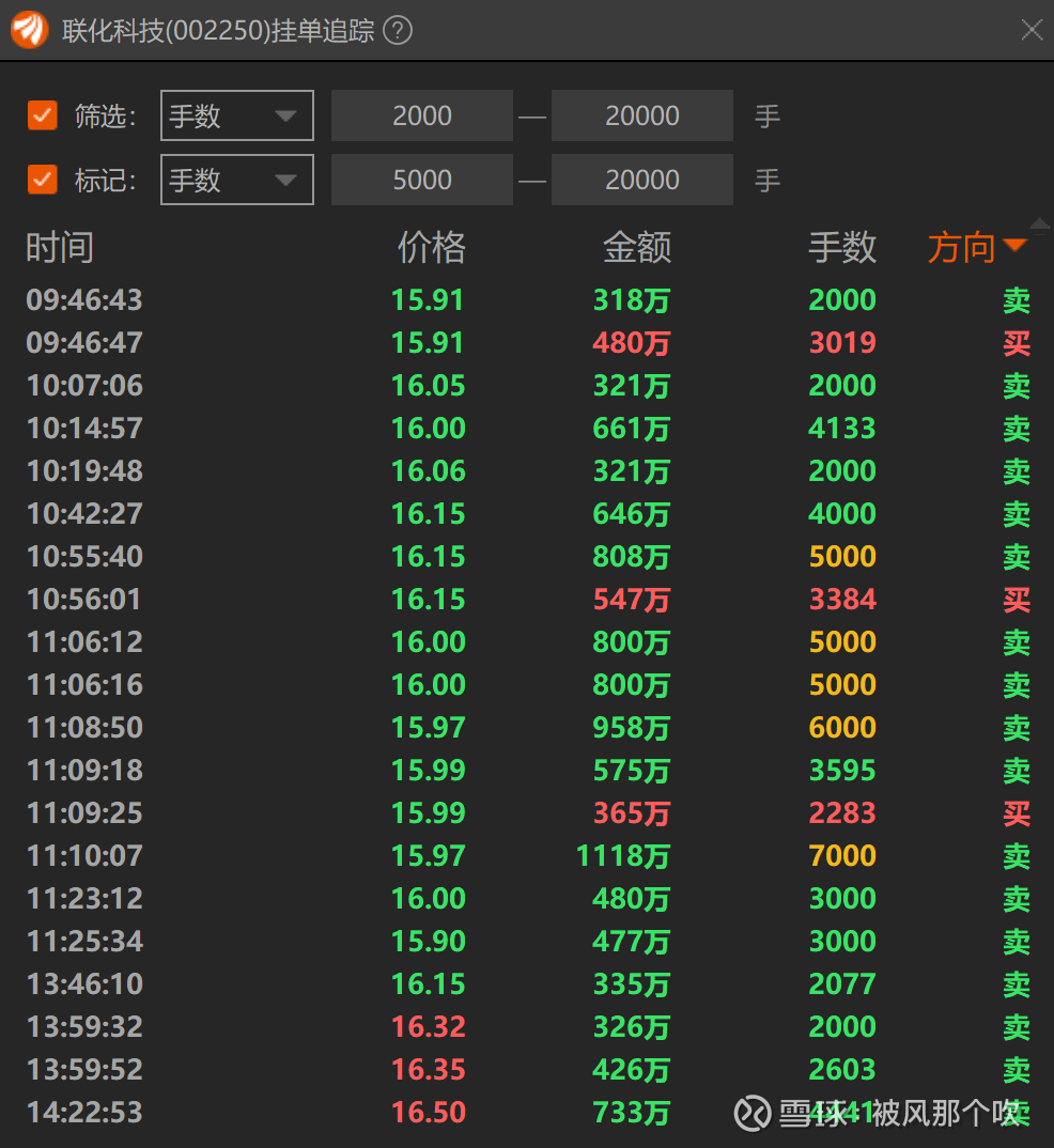 本周二开始缓慢加速,周四的涨停板犹犹豫豫,先上板,然后炸板,再经过长时间的充分换手尾盘拉板,成交额也来到了近期的高点16亿元,周五高开低走,尾盘又拉到水上,成交额也来到了15.85亿元。主力为什么这么做?如下截图,看周四的分时,结合炸板再回封,以及逐笔大单可以发现,主力在拉板,但没有强势封板,而是炸板后顺势吸筹再封板,周五虽有几个大单出逃,但1000多手的买单非常多,多到两张截图放不下,只能放一张2000手以上大单的截图了,尾盘拉至水上也充分说明了承接资金充足。
