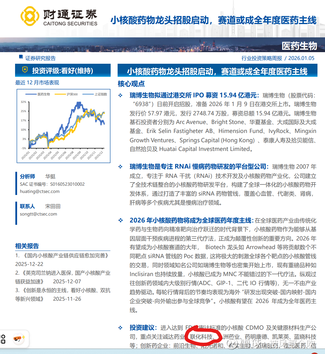2、医药价值回归,特别是小核酸的重大发展机遇。元旦过后,创新药突然持续拉升,其中最火热的细分赛道之一是小核酸。小核酸头部企业瑞博生物港股上市,促进市场对小核酸板块关注度提升。小核酸赛道的悦康药业一周大涨40%,前沿生物一周大涨56%。简单来说,传统的药物只能处理致病蛋白,治标不治本,而小核酸药物能处理生成致病蛋白的核酸,直达病灶核心。财通证券1月5日发布研报:小核酸药物龙头招股启动,赛道或成全年度医药主线。研报首页的投资建议:进入达到 FDA 审计标准的小核酸 CDMO 及关键原材料生产公司,重点关注诚达药业、联化科技、九洲药业等,如最后截图所示。