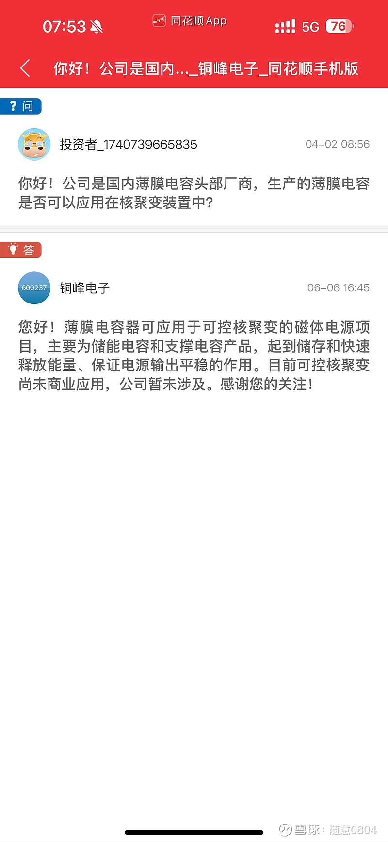 以下是铜峰电子官方在互动平台的回复(2025年6月6日):薄膜电容器可应用于可控核聚变的磁体电源项目,主要为储能电容和支撑电容产品,起到储存和快速释放能量、保证电源输出平稳的作用。