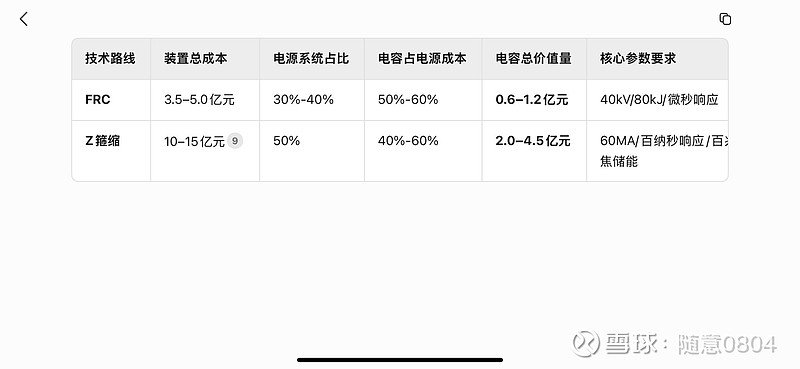 那具体来说,单个核聚变装置需要多少的脉冲电容呢?一般来说,目前可控核聚变的路线有两大类:FDC和Z箍缩。Z箍缩路线因电流强度要求更高,电容技术壁垒和单价显著高于FRC。上述仅仅是一台核聚变装置中电容价值量。