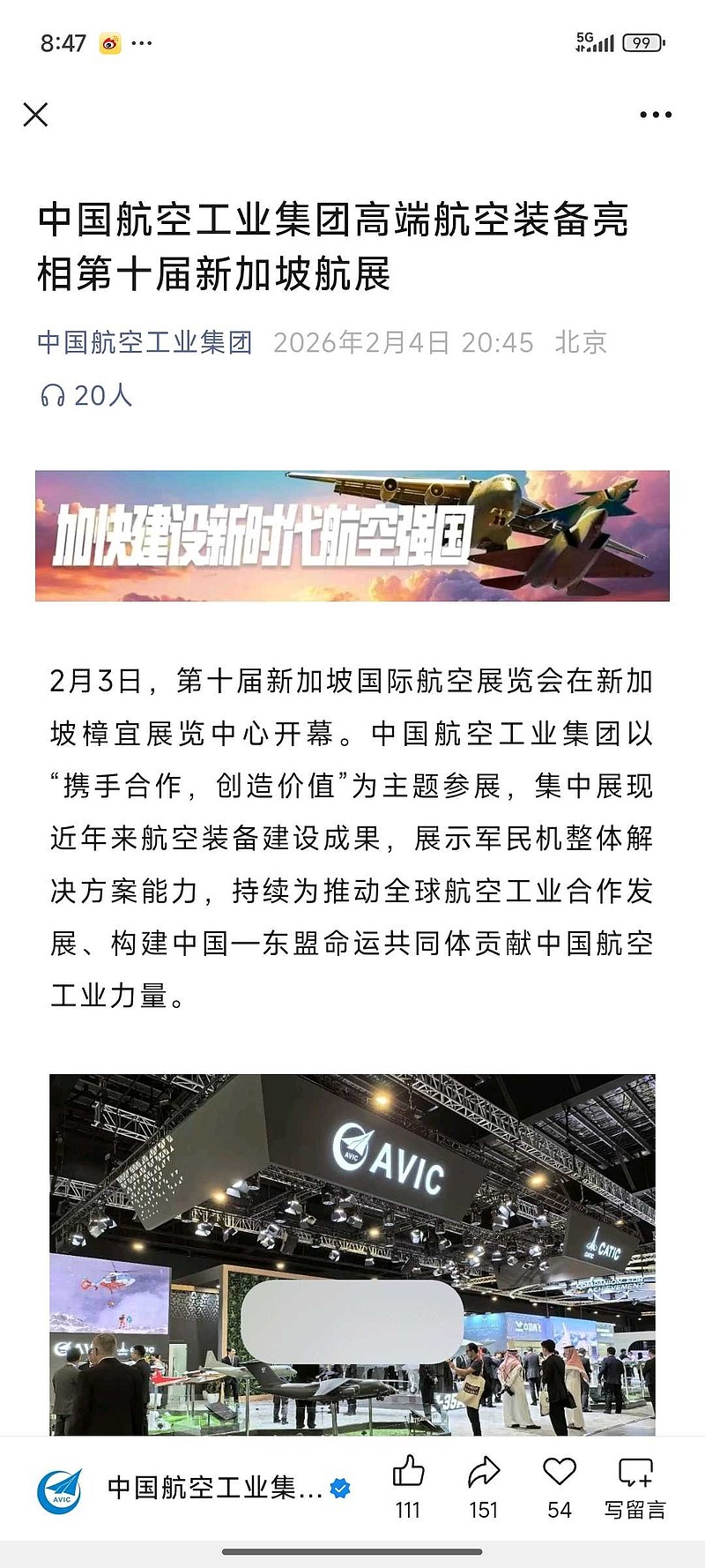 $中航成飞(SZ302132)$ 本届新加坡航展,航空工业集团一体推进展、宣、谈,围绕重点产品积极开展营销推介,借势借力拓展潜在市场空间。航展前两日,40多个用户高层团组到访航空工业集团展台,就相关产品与项目开展交流对话,共同推进合作交流与重点项目落实。画重点
