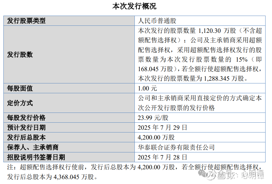 本次发行1120.3万股,发行价23.99元,超额配售15%(即168.045万股),超额配售后总发行1288.345万股,总股本4368.045万股。战略配售224.06万股,占超额配售前发行数量的20%,网上发行1064.285万股,发行规模比较少,门槛高,也没有流通老股。