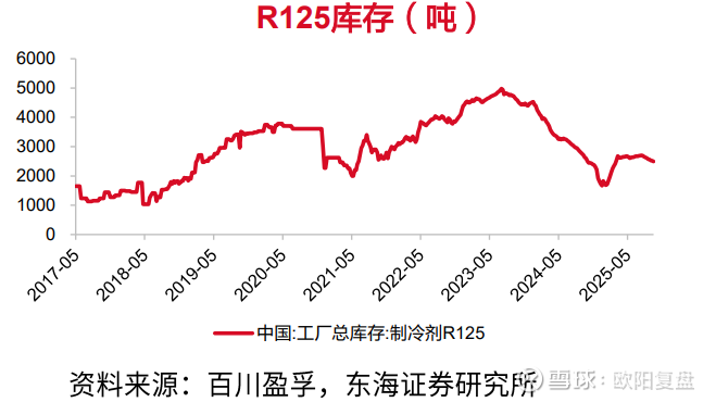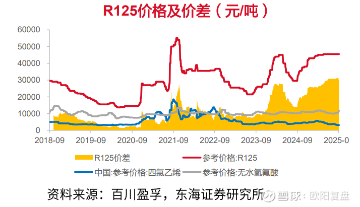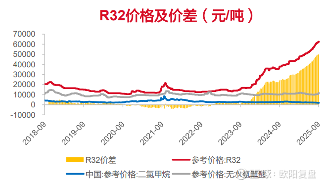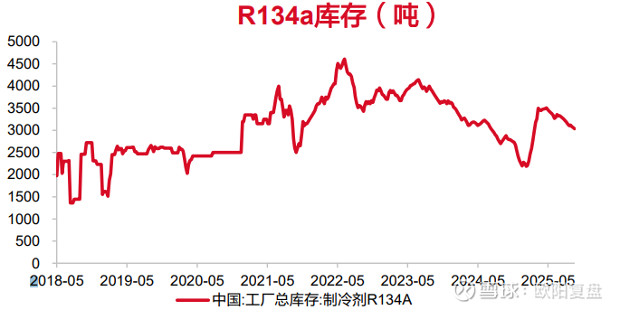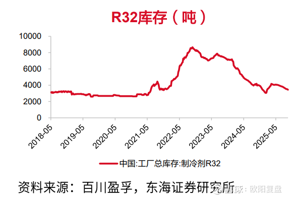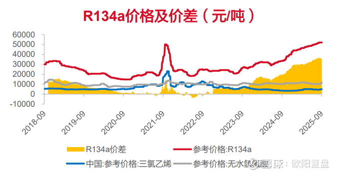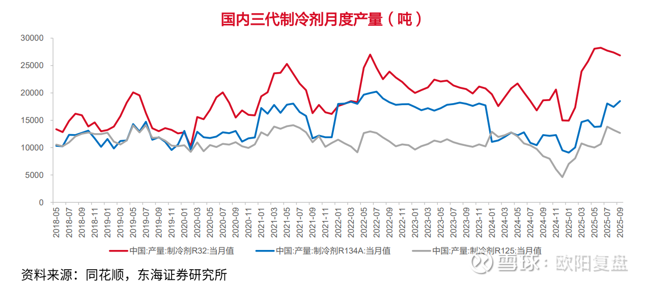 第三代制冷剂在持续高价的同时产量也保持高增(根据百川盈孚,2025年9月,国内R32、R134a、R125产量分别为26851吨、18515吨、12675吨,同比分别变动43.97%、50.53%、50.18%,环比分别变动-1.98%、6.14%、-4.16%。)