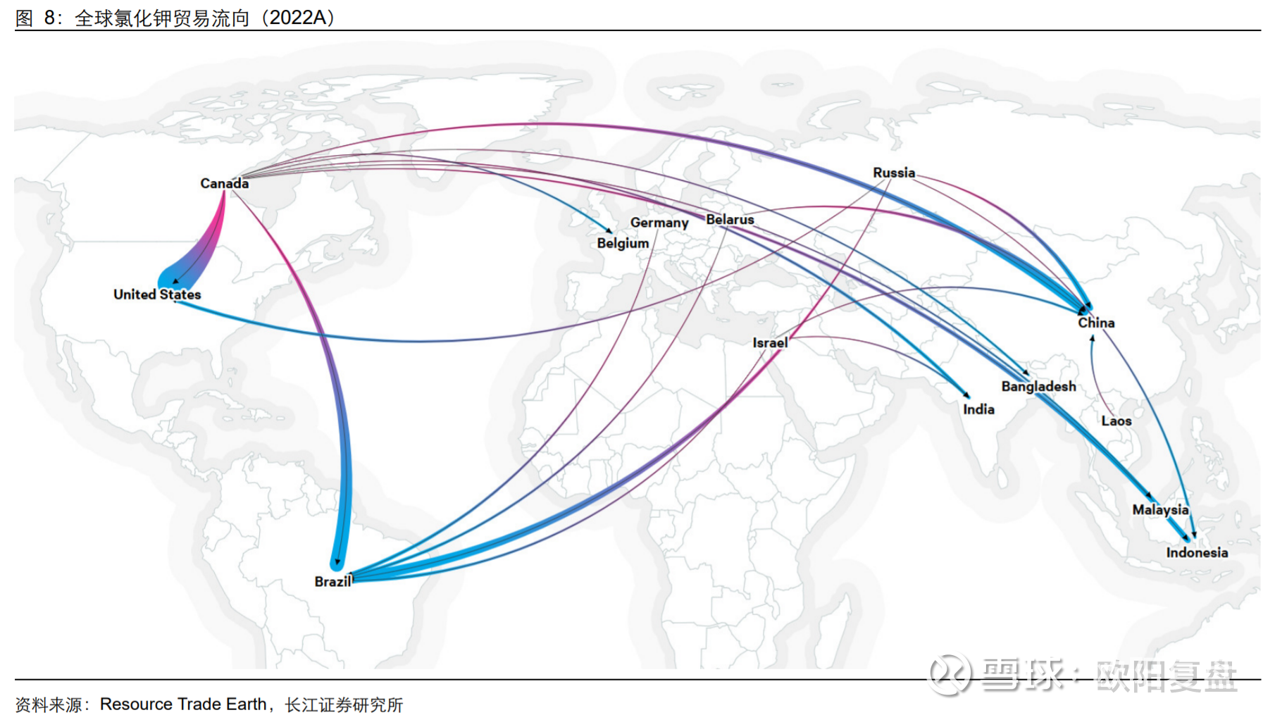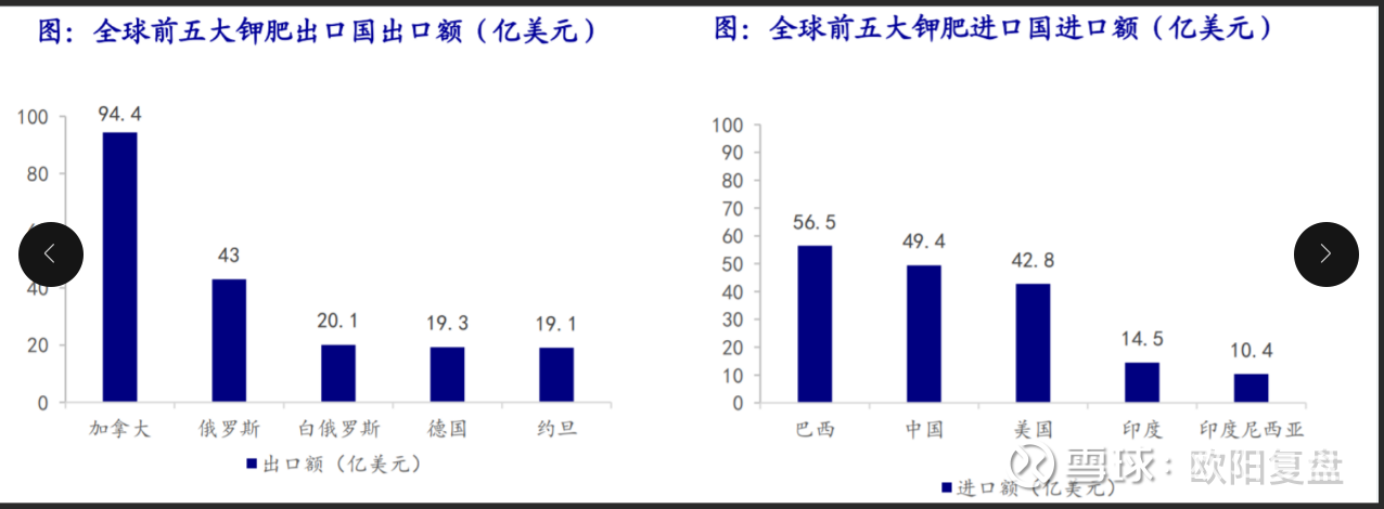钾肥主要应用于农作物种植,主要的农业种植带在美国、中国、巴西和东南亚,然而钾矿又主要集中在加拿大、俄罗斯、白俄罗斯等国,资源国和农业国地理位置的不重叠,决定了全球氯化钾商业模式的核心围绕国际贸易——由资源国生产,在农业国消费。根据OEC数据,2023年全球前五大钾肥出口国分别为加拿大、俄罗斯、白俄罗、德国、约旦,出口总值为196亿美元。以加拿大位居全球第一,出口总额为94.4亿美元,第二大为俄罗斯,出口总额为43.0亿美元,第三大为白俄罗斯,出口总额为20.1亿美元。而从进口来看,前五大进口国进口总额为173.6亿美元。以巴西位居全球第一,进口额为56.5亿美元,第二大为中国,进口额为49.4亿美元。