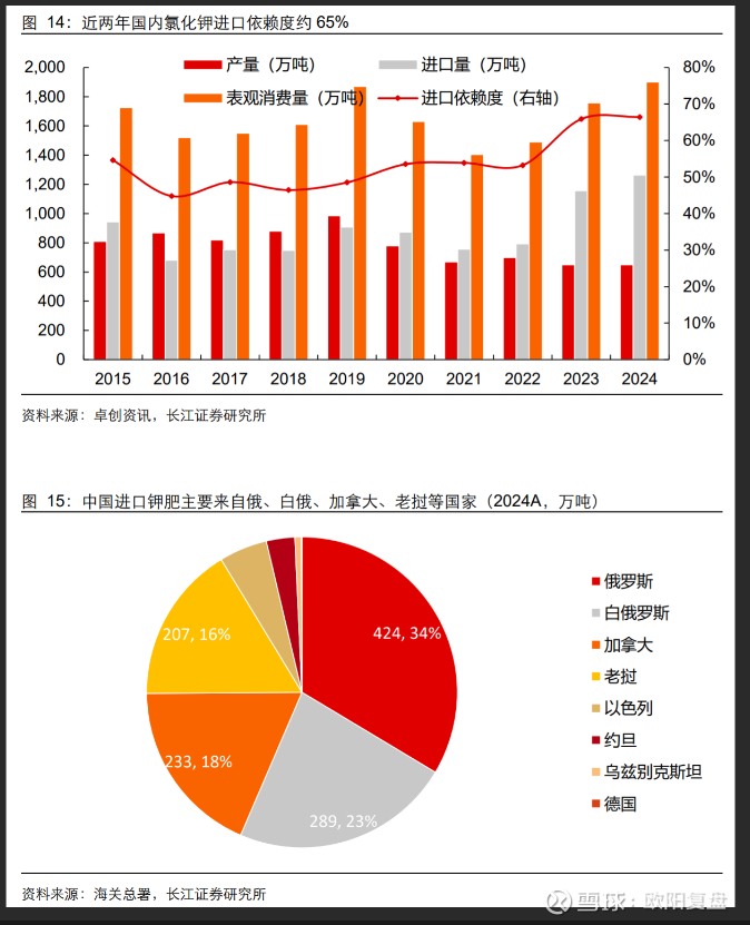 加拿大:主要钾肥生产商包括 Nutrien 和Mosaic,两者在 2024 年的钾肥销售量分别达到 1389 万吨和 870 万吨,主要供应市场为美国与巴西。其中美国每年通常消耗 1200 万-1500 万吨钾肥,85%以上来自加拿大。巴西 2024 年进口氯化钾达到 1406 万吨,大部分来自加拿大及俄罗斯。