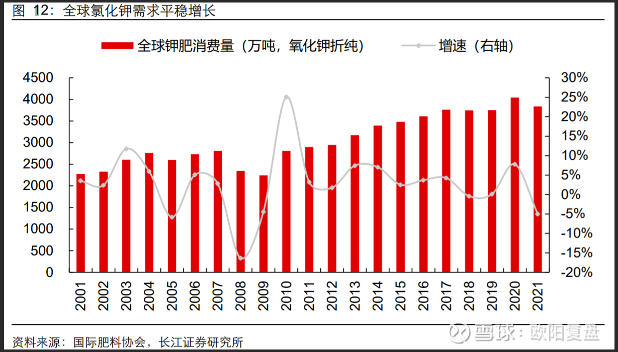 长期来看由于全球人口持续增长,粮食需求随着增长,对钾肥的需求也平稳的增长。2001~2021 年年复合增速约 2.64%。历史增速对应当前 约 7000 万吨的总需求,每年的需求增量约 150-200 万吨。
