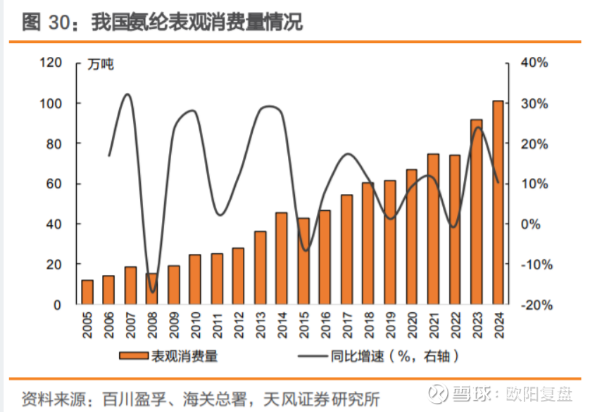 氨纶是一种弹性织物,下游主要用于运动服、内衣和袜子等。2005-2024年需求量CAGR 达到11.8%,增长比较稳定。服装产业跟随宏观经济波动,近两年经济放缓,目前国内处于降息降准周期,美国也处于降息周期,一旦26年经济回暖服装市场回暖会给氨纶带来更多的需求。