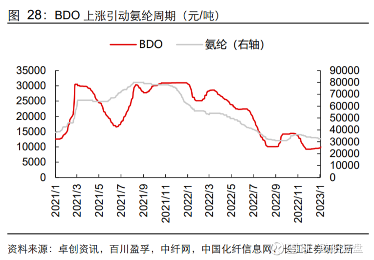 成本端:氨纶的主要原材料是PTMEG和纯MDI,当年首先是节能降碳政策影响电石-BDO-PTMEG产业链供给,可降解塑料那年也大幅投产,可降解塑料的原材料也是BDO,使得BDO的需求大幅上升,价格也水涨船高,支撑了氨纶的价格。