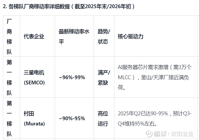 公司在半年报中透露业绩的增长主要来自于AI 领域的前瞻性战略布局充分兑现,推动业务规模放量。早在 AI 产业规模化发展前,公司已构建覆盖服务器及电源、光模块、智能驾驶等多维度细分应用领域的优质客户矩阵,AI方面的需求在25年处于爆发状态是毋庸置疑的,通过核心企业三星机电和村田的稼动率也可以看出需求的火爆。26年随着科技企业的持续扩产需求具有持续性。