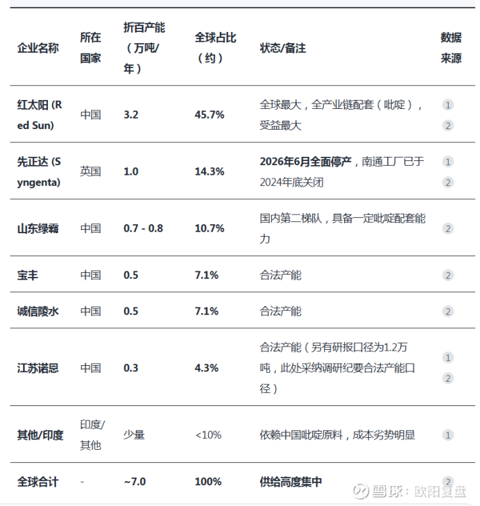 据世界农化网,先正达近日宣布将于2026年6月底前全面停止百草枯除草剂的全球生产,目前全球百草枯折百产能在7万吨左右,这次关闭的英国工厂百草枯折百产能为9000吨,意味着全球供给将减少1/7。红太阳为百草枯的全球龙头,折百产能3.2万吨,先正达退出后,红太阳全球产能占比将超过50%。